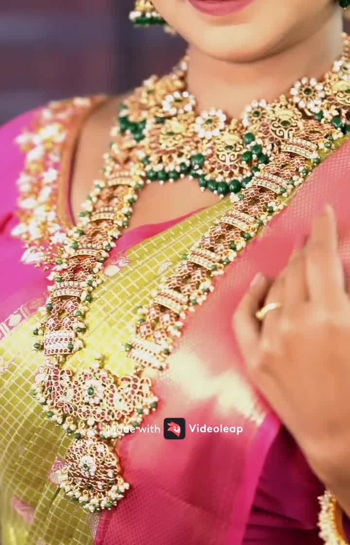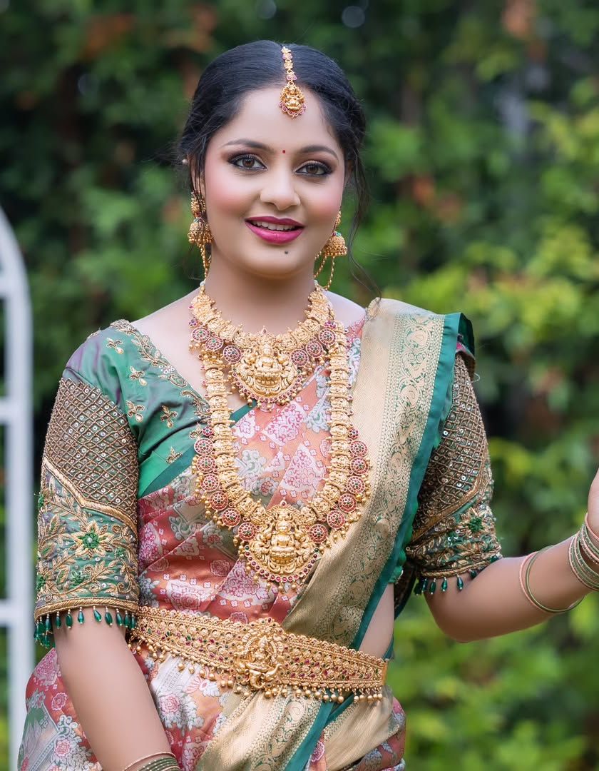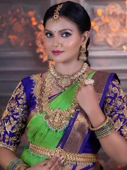 My collection of classic temple jewellery is perfect for your `mugurtham` or traditional ceremony. Find authentic designs like goddess chokers, mango harams, guttapusalu necklaces, and matching jhumkas, all available for rent.