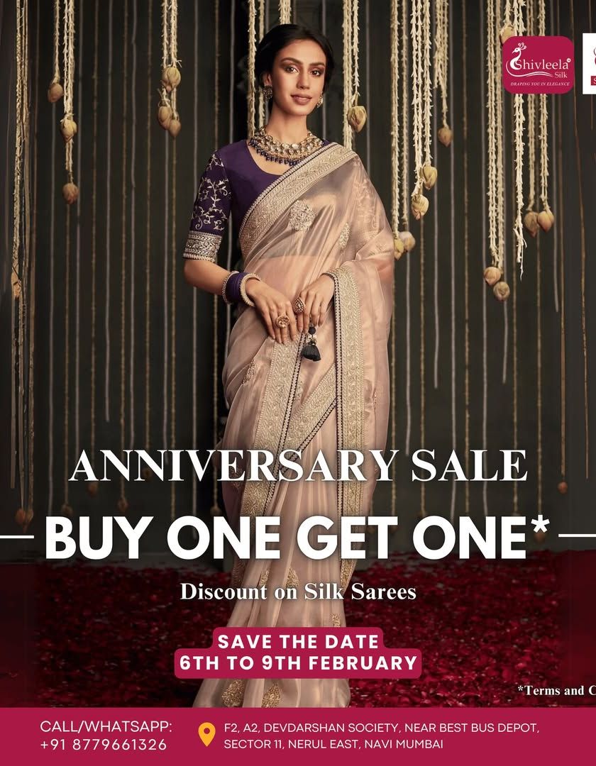 I believe in offering great value, and our annual anniversary sale is my way of giving back. This gallery showcases some of the beautiful sarees and offers from our popular "Buy 1 Get 1 Free" and other promotional events.