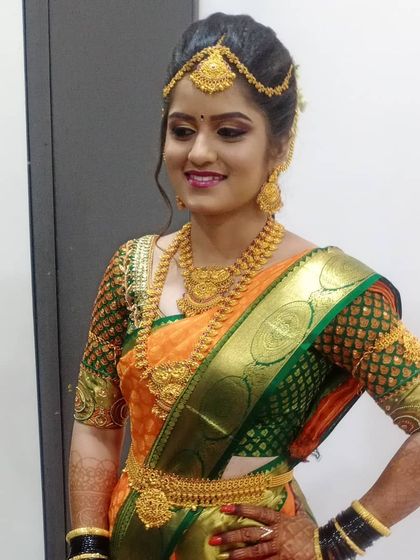 Hey, I'm Shobha Shetty. Born and raised in namma Bengaluru (our Bangalore), makeup is my thing - not just work, it's a vibe for me. That look in a bride’s eyes when she sees herself? Gives me chills every time. I get to travel all over Karnataka, meet amazing folks, and be part of their big days. Being trusted for someone’s special moment - honestly, nothing beats that.