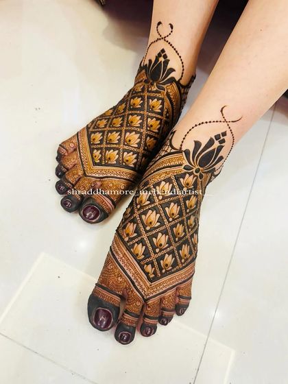 Mehendi on the feet is an essential part of the bridal look and is also popular for festivals. I create a variety of designs for feet, from full coverage traditional patterns to simple, modern motifs that beautifully adorn the ankles and toes.