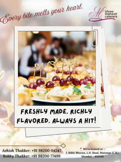 Matunga is home and food is in our blood. For 40 years, Shree Mahavir Caterers has been all about pure veg cooking, starting with classic Indian flavours for Diwali, Vagh Baras and all that. Now we go global, mixing Italian, Mexican, Japanese - you name it. Still, our heart is in making every celebration in Mumbai taste like happiness. We use the best stuff, never compromise. Food isn’t just food for us, it’s what brings people together.