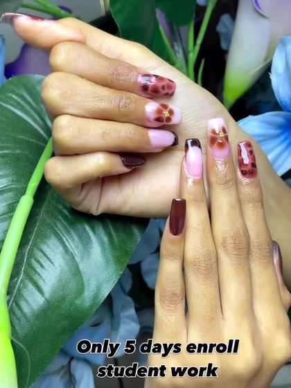 I am so proud of the work my students produce. This gallery showcases the incredible variety and quality of nail art they learn to create, including 3D flowers, chrome effects, French tips, airbrushing, cat-eye, and detailed brush art.