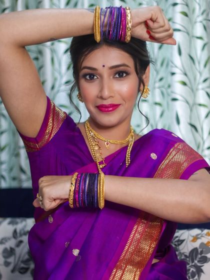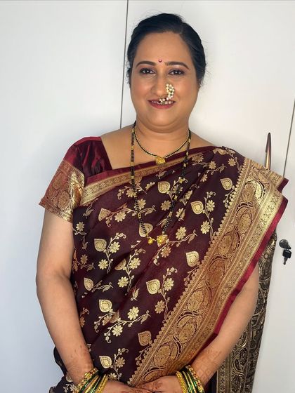 I specialize in creating authentic Marathi looks for festivals like Gauri Ganpati, Mangalagaur, and traditional ceremonies. From the classic nauvari saree draping to pairing the perfect nath and jewelry, I ensure you look graceful and radiant. This includes looks with Paithani sarees and traditional hairstyles featuring mogra gajras.