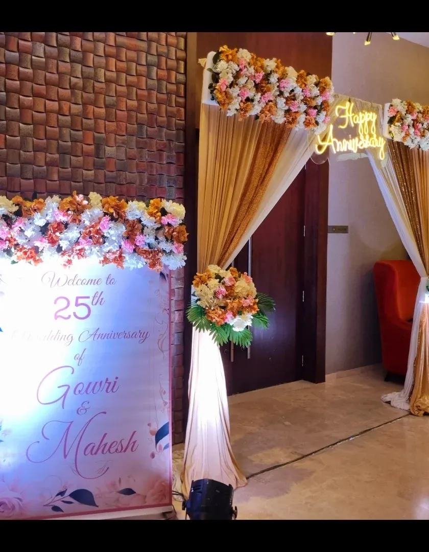 For milestones that deserve a touch of class, I design sophisticated decor. These setups feature beautiful floral arrangements, elegant drapery, and ambient lighting to create a warm and memorable atmosphere for anniversaries and engagements.