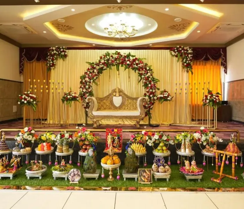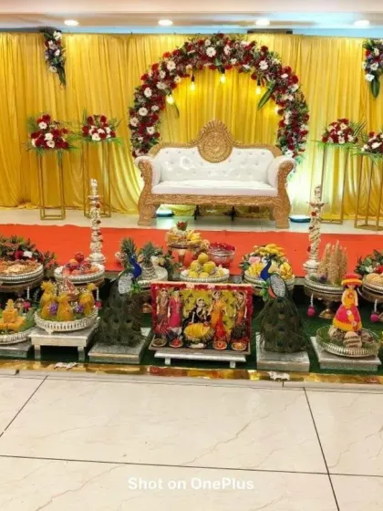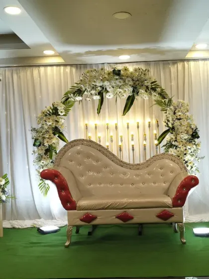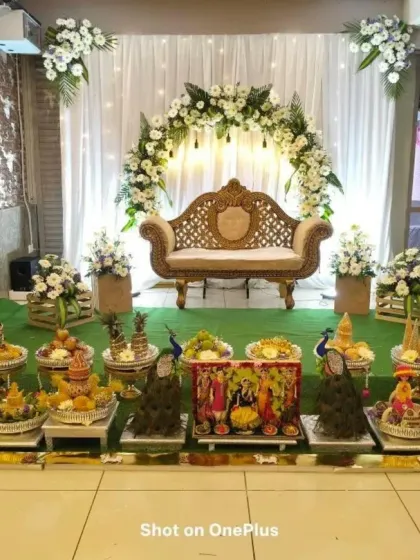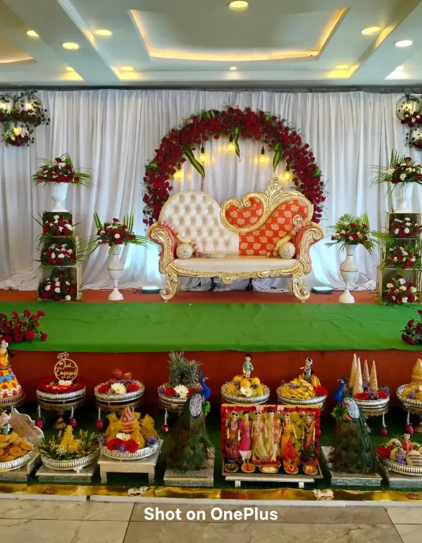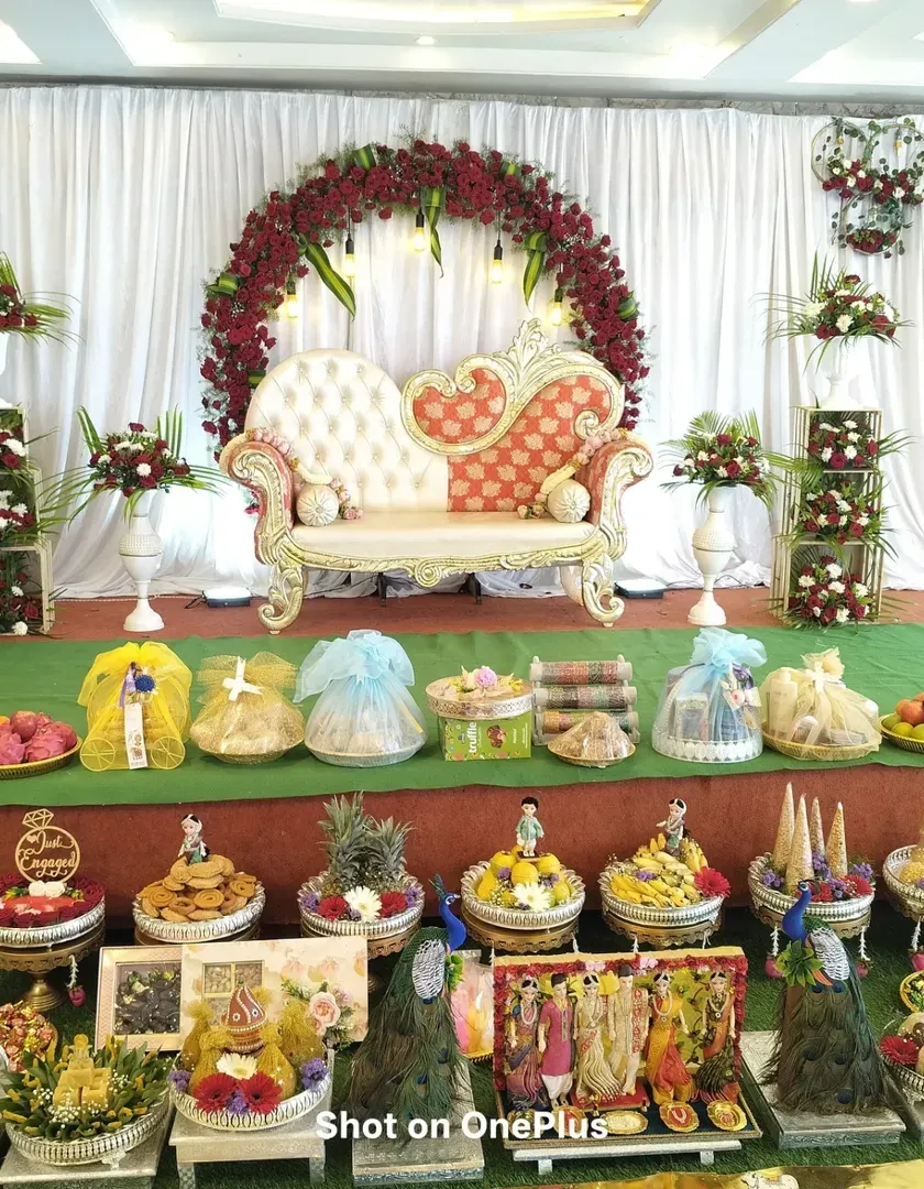 I create vibrant and joyous decorations for Seemantha and Half-Saree ceremonies. These setups typically include a beautifully decorated stage with an ornate sofa for seating, a floral backdrop, and an elaborate display of Seer Thattu (traditional gifts). I can work with various color palettes, from classic red and gold to elegant white and green.