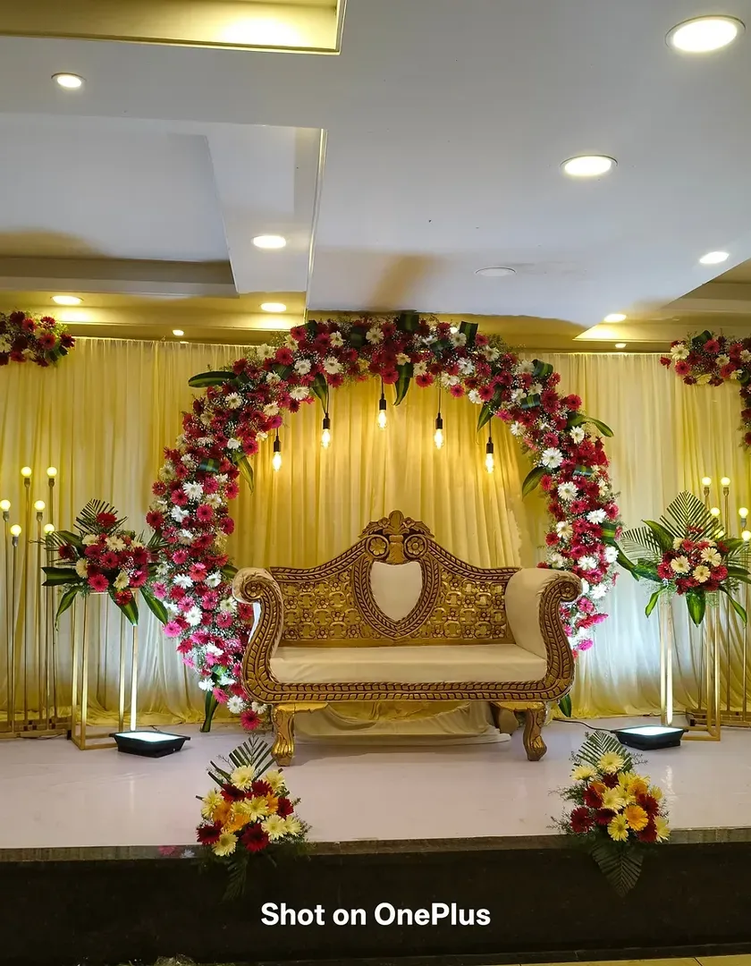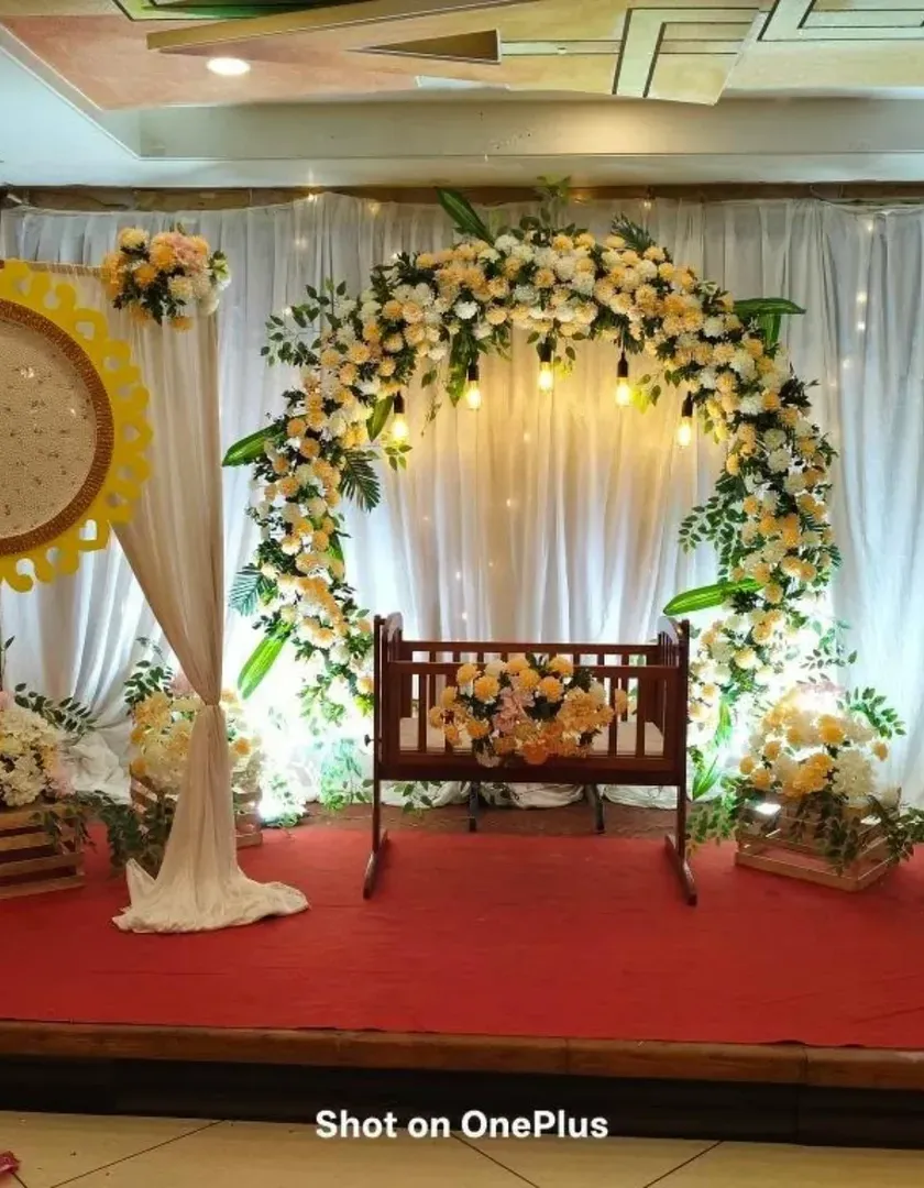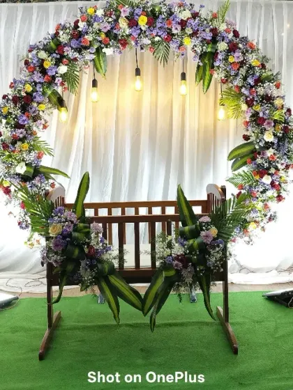 I design peaceful and beautiful setups to welcome the newest member of your family. My focus is on decorating the traditional cradle (thottilu) with fresh flowers and creating a lovely backdrop, ensuring the central moments of the ceremony are picture perfect. I offer various themes, from simple floral arrangements to grand, circular arches.