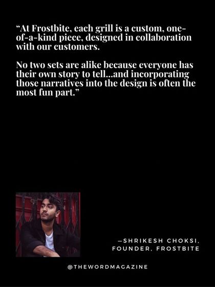 2023 was wild - over 100 gigs, felt like I was living in the chaos and loving every minute. Moving back to Bombay made me see the city with new eyes. Frostbite Lab started as a lockdown daydream, chasing grillz and jewellery inspired by the streets, the people, all the everyday stuff. Had to convince old-school karigars to try something fresh on teeth. Best part? Watching my dadi crack up wearing my grillz. Family rocking them too - nothing like it.