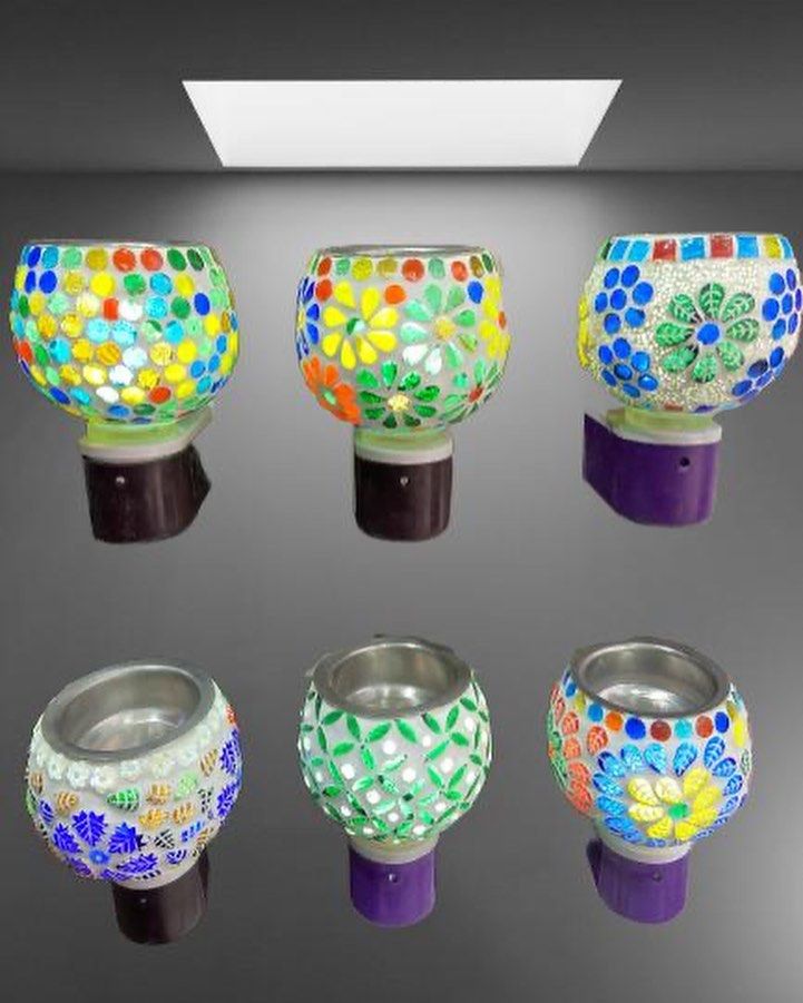 These beautiful mosaic lamps are a customer favorite because they work as both a night lamp and an aroma diffuser. Simply plug it into any wall socket to enjoy a soft, colorful glow and your favorite fragrance. Each piece is handcrafted with unique patterns like flowers, leaves, and polka dots.