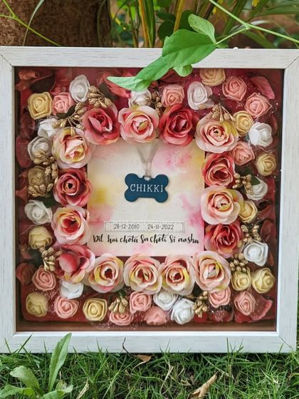 - Composition: 3D arrangement of artificial flowers, photos, and physical keepsakes (pet tags, lockets).