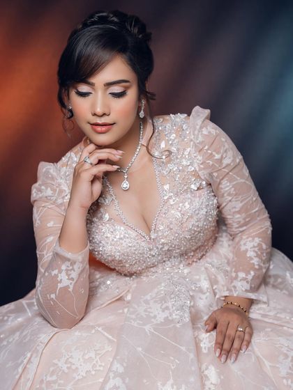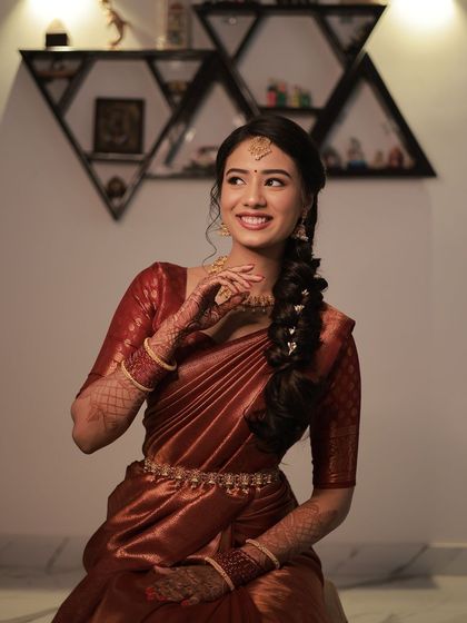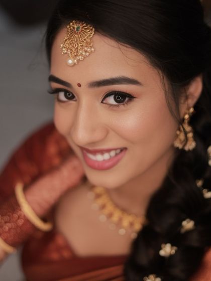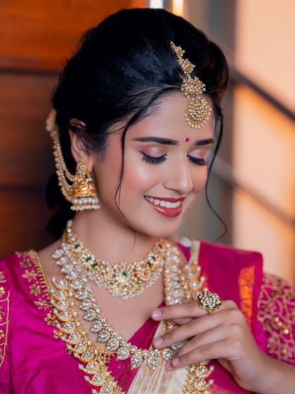 I mostly stick to minimal wedding day makeup, especially for brides who want that “just healthy skin” vibe. If you’re into that glass skin or dewy wedding makeup look, I’ve got you. I also do classic styles - bold lips, defined eyes - if you’re going for a more traditional feel. For South Indian bridal look, I pay extra attention to matching the makeup with saree and jewellery, so you don’t look mismatched in pictures.