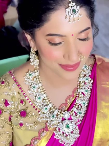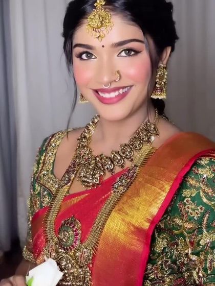 I specialize in creating timeless Muhurtham looks that honor tradition while feeling fresh and radiant. My focus is on flawless skin that lasts through the long ceremony and makeup that perfectly complements your Kanjivaram saree and temple jewellery.