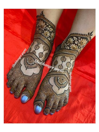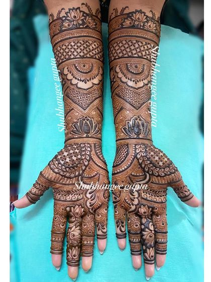 I create comprehensive bridal mehndi designs that cover hands, forearms, feet, and legs. My designs incorporate traditional motifs like peacocks, paisleys, and architectural elements, with the option to include personal touches like initials or specific themes.