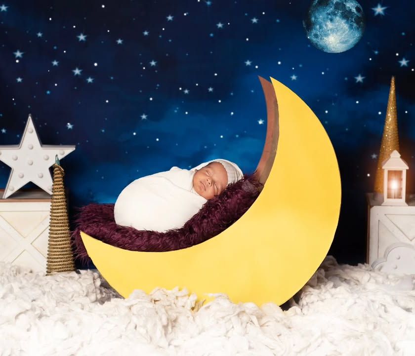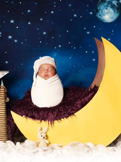 From sleeping on the moon to dreaming amongst the stars, these setups are designed to be pure magic. We use a variety of props like crescent moons, fluffy clouds, and starry backdrops to create a whimsical, otherworldly feel for your baby's first portraits.