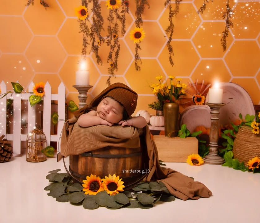 Bright, cheerful, and full of warmth. This theme is built around a sunny yellow color palette, with sunflowers, a honeycomb backdrop, and bee-themed elements. It’s a wonderful way to capture the sweetness of your new baby.
