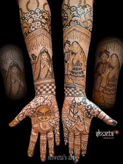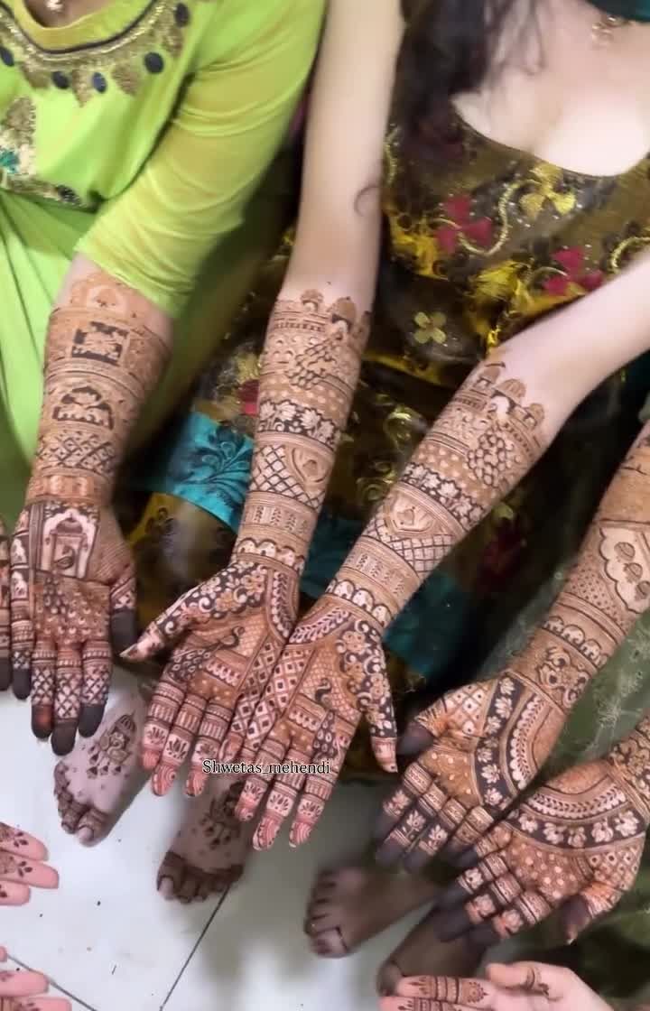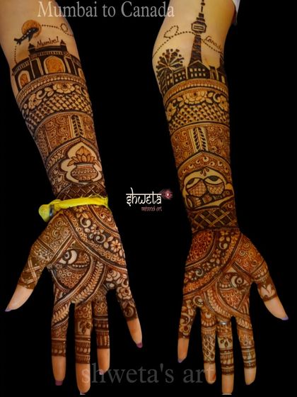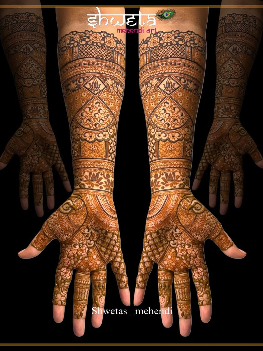 For the bride who wants the full royal treatment. These are my intricate, full-coverage designs that extend up to the elbow, filled with traditional motifs, delicate shading, and personalized elements. I work with styles ranging from classic Indian to detailed Indo-Arabic patterns.