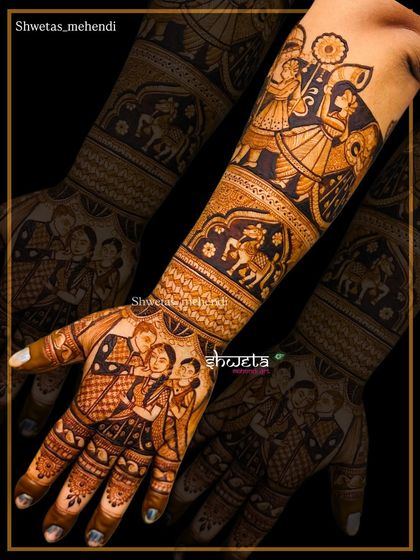 Custom Storytelling Designs - Couple figures, wedding logos, baraat, 'two-states' themes - your story, my mehendi art.