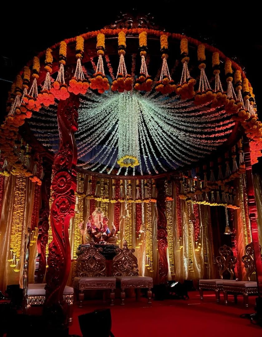I create authentic and beautiful setups for your most important traditions. This includes grand mandaps for Ganesh Chaturthi, traditional vidhi mandaps for weddings, and custom stages for religious ceremonies, using flowers like marigolds and jasmine.
