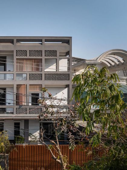 This multi-generational home in Hapur responds to its industrial context with a rugged, protective facade of fly-ash brick and concrete. Inside, the design inverts, creating a refined and tranquil oasis with light-filled courts and a warm, tactile material palette.