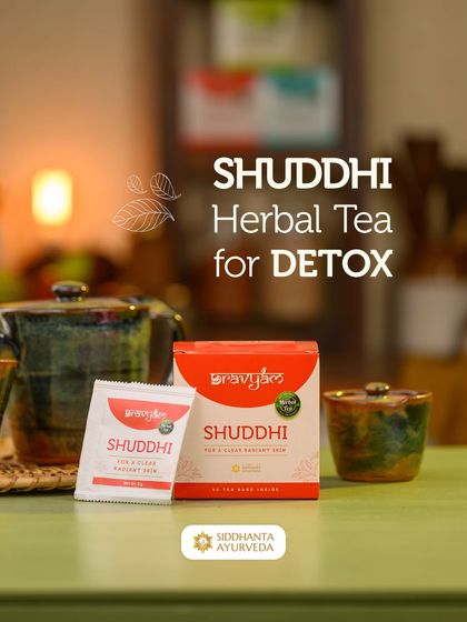 To support your wellness journey at home, I have formulated a collection of herbal teas called Dravyam. Each blend is crafted with specific Ayurvedic herbs to address different needs, such as improving digestion, promoting clear skin, managing blood sugar, and reducing stress.