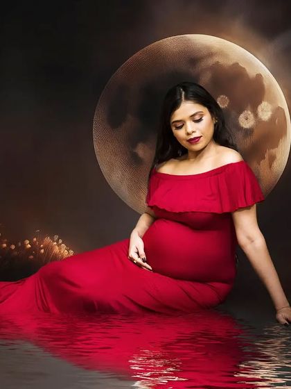 - Dramatic and fine art maternity portraits with bold colors and moody backgrounds. It’s perfect if you want something striking, like a red gown popping against deep shades.