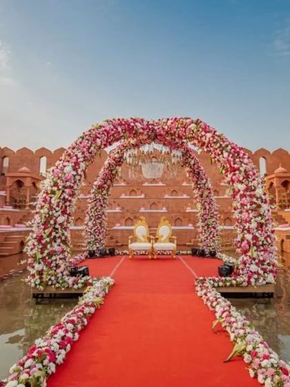 - Open-Air Mandap: 4-Pillar Bamboo or Wooden finish structure with chiffon draping and floral runners designed for wind flow.