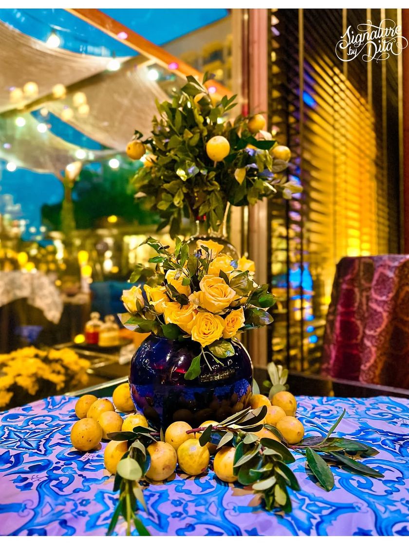 I transport your guests to the Italian coast with this bright and breezy theme. I use fresh lemons, vibrant yellow and blue florals, and patterned linens to create an authentic, sun-drenched Sicilian summer vibe for your dinner party or event.