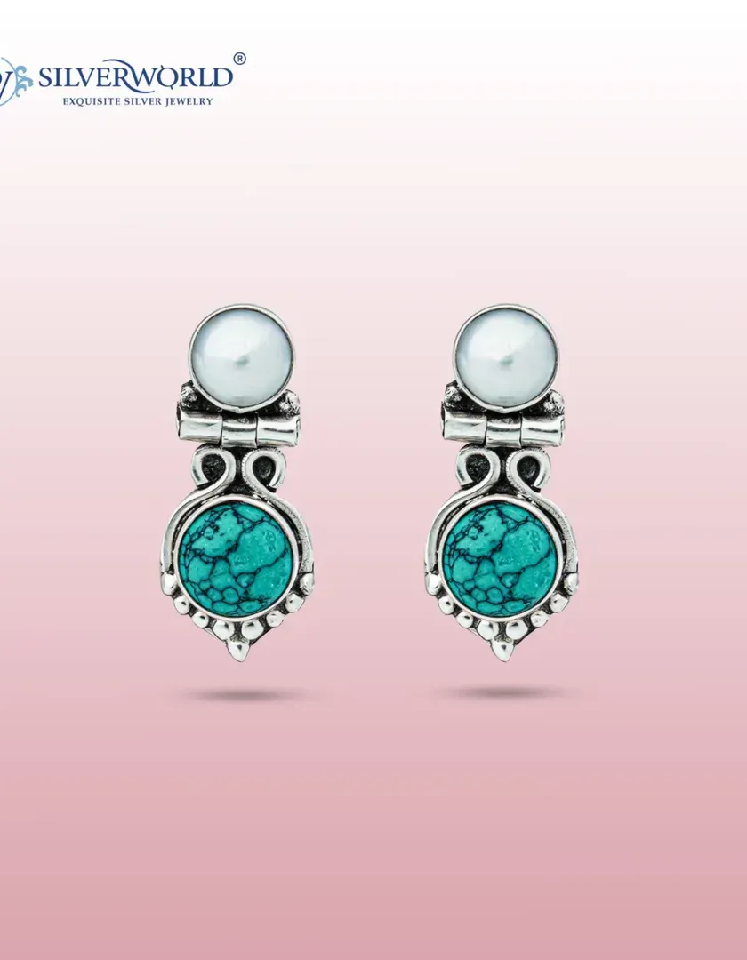 Add a splash of color with our gemstone earrings, all set in certified 92.5 silver. Our collection features a variety of stones like vibrant turquoise, rich green onyx, and classic pearls, available in both modern studs and traditional drop designs.