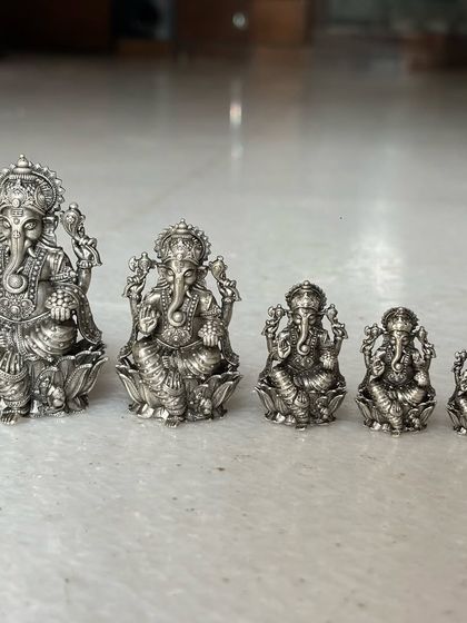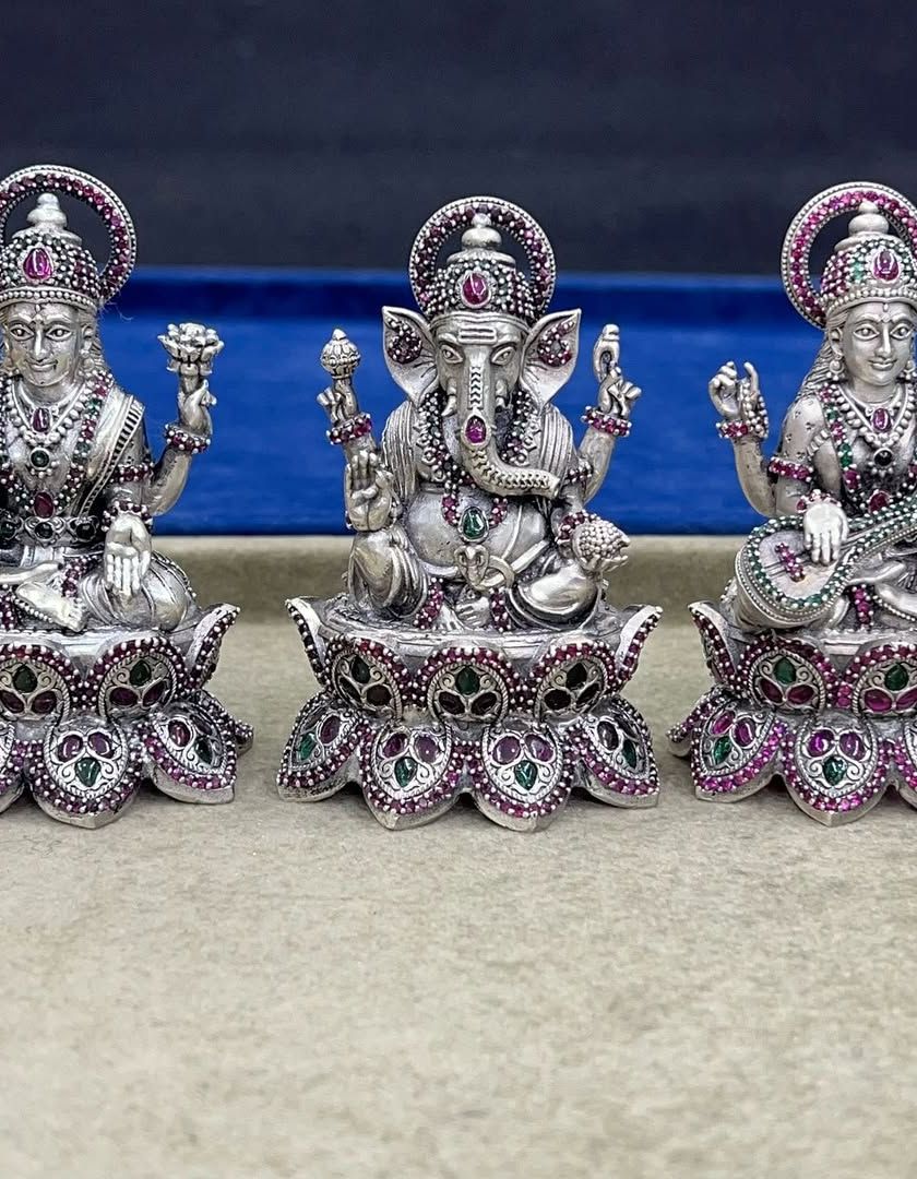Discover our collection of pure silver religious idols, crafted with immense detail and devotion. We offer murtis of various deities like Lord Ganesh, Lakshmi, Krishna, and Shiva in different sizes, finishes including antique and dual-tone, and with or without stone embellishments to suit every budget and preference.