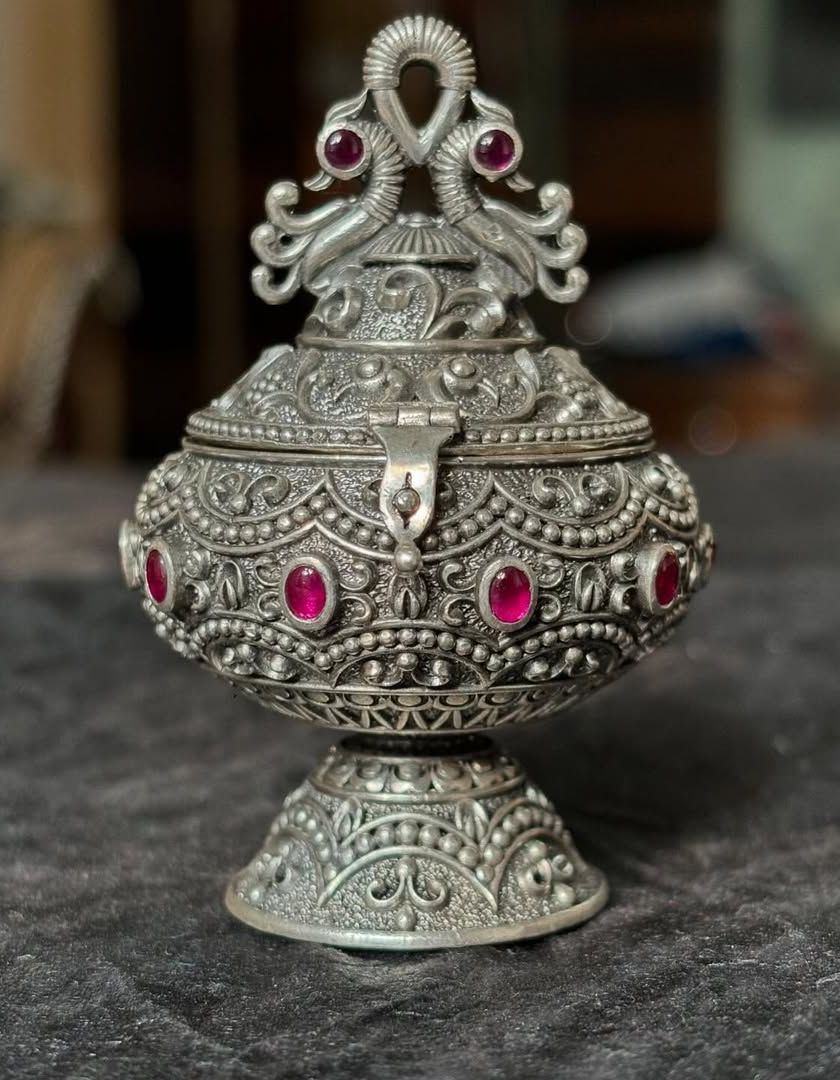 Enhance your spiritual practices with our pure silver pooja articles. Our collection includes simple and elegant pooja thalis for daily use, ornate kumkum boxes perfect for gifting, and traditional silver diyas to light up your home during festivals.