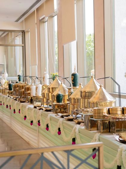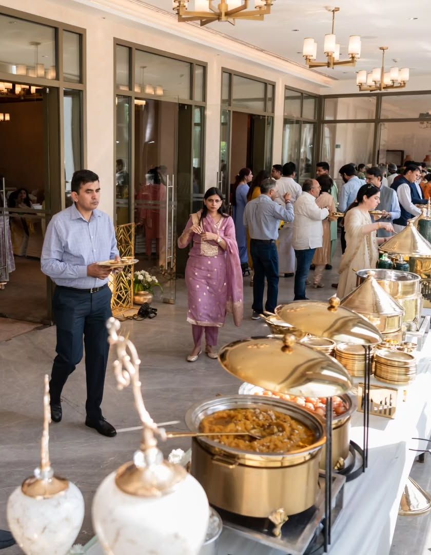 I design sophisticated buffet presentations using my signature silver-plated and traditional golden serveware. Each setup is complemented with floral arrangements and meticulous detailing to create a royal and elegant dining atmosphere for your corporate galas, pujas, and upscale events.