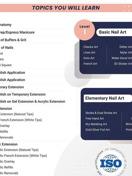 I teach you nail art in my salon with real clients, hands-on for 15 days, using pro tools and giving you an ISO certified nail technician certificate.