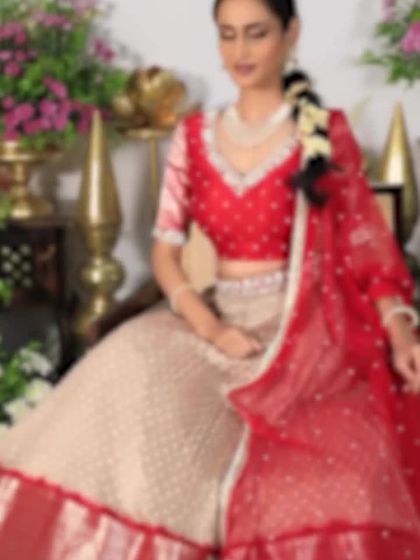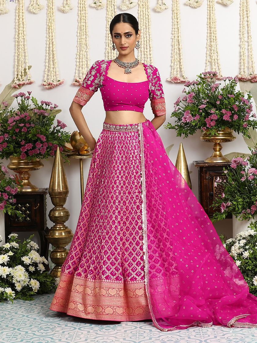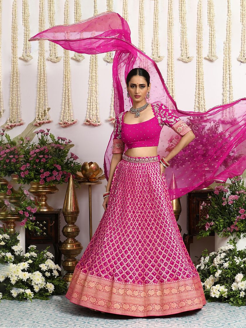 An ode to the timeless bride, this collection features our most opulent lehengas in auspicious shades of red, pink, and gold. Each ensemble is handcrafted with luxurious silks, Banarasi weaves, and intricate Bandhani work, designed to be a cherished heirloom for generations.