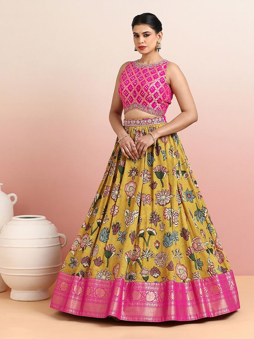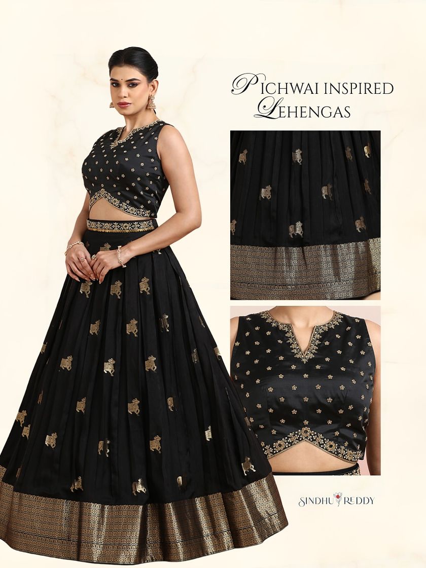 This collection celebrates the beauty of wearable art, featuring lehengas and sarees adorned with intricate prints. From sacred Pichwai motifs to bold, modern florals and mythological narratives, each piece is a canvas of color and storytelling.