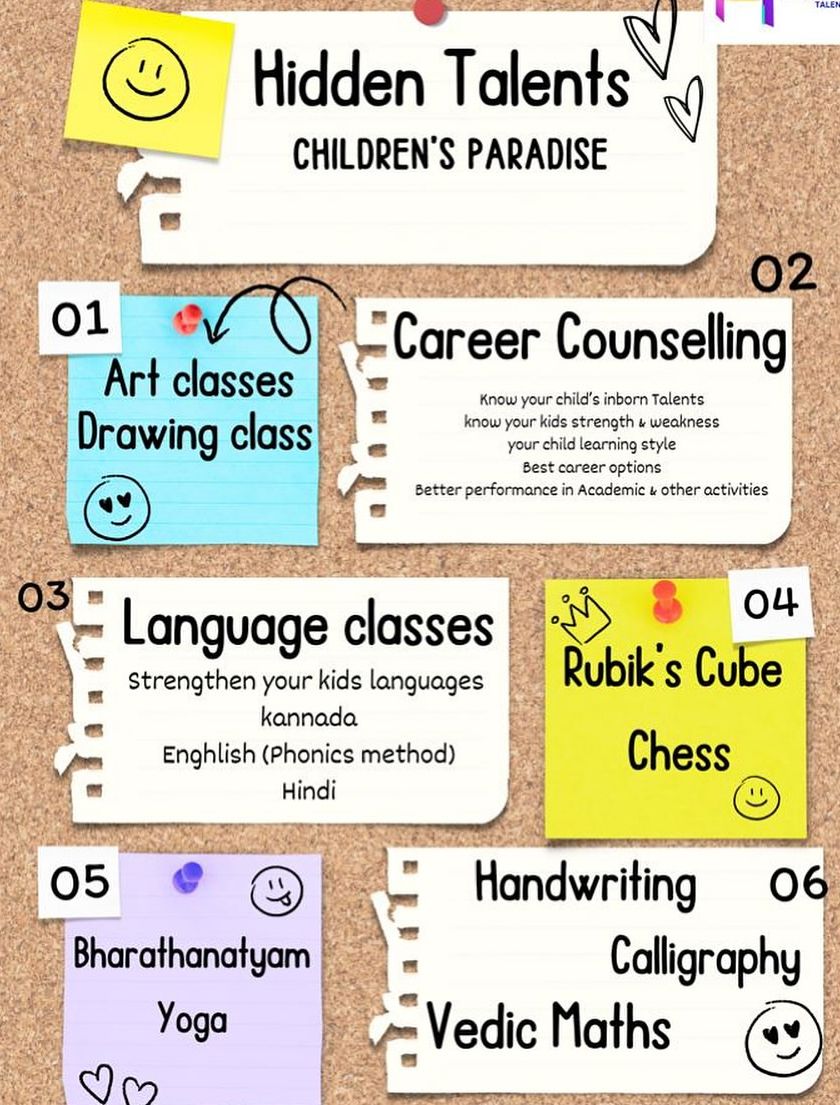 At my center, I offer a variety of programs to help in your child's holistic development. This includes activities like art, chess, Rubik's cube, and handwriting to nurture all their hidden talents.