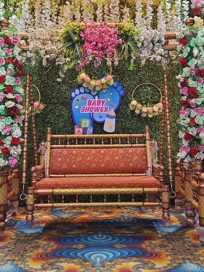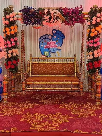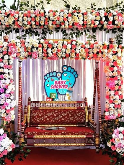 Theme & Props - Traditional floral jhula, moon cradle props, shimmer backdrop setup, cartoon themes like Frozen or Boss Baby, we handle it all.
