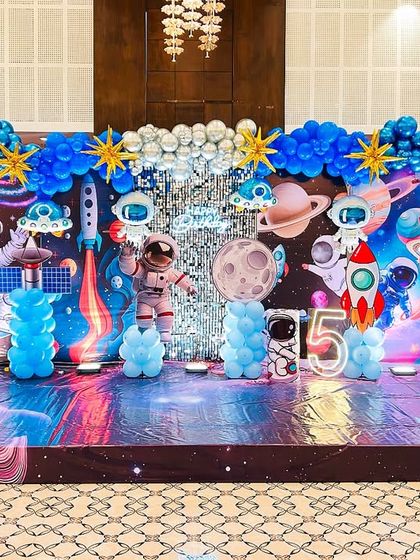 - Printed Flex Background: An 8ft x 8ft high-resolution printed backdrop mounted on a wooden frame, customized to the theme (e.g., Jungle, Space, Cocomelon).