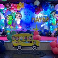 One of my most requested themes, perfect for first birthdays. I bring the world of Cocomelon to life with vibrant backdrops, life-sized cutouts of all the characters, and fun props like the yellow school bus.