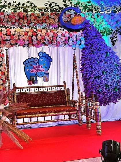 Theme & Props - Traditional floral jhula, moon cradle props, shimmer backdrop setup, cartoon themes like Frozen or Boss Baby, we handle it all.