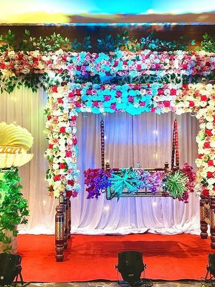 We specialize in creating enchanting setups for naming ceremonies using floral arrangements, thematic backdrops, and personalized elements. Our decorations feature traditional touches like crescent moon structures and swings, complemented by balloon artistry and floral designs.