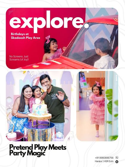 Hey, we’re Skadoosh. Childhood’s supposed to be wild, noisy, and packed with magic, right? That’s why we made this place—kids running around, making up stories in pretend play zones, tumbling (don’t worry, every corner’s padded). Parents, we see you too. Mamma ek kaam karo na... usko Skadoosh leke chale jao (Mom, just bring them to Skadoosh). You get to chill, sip your coffee, and watch the madness from our see-through wall. Over 300 birthdays later, we still love seeing parents finally relax while their kids go nuts.