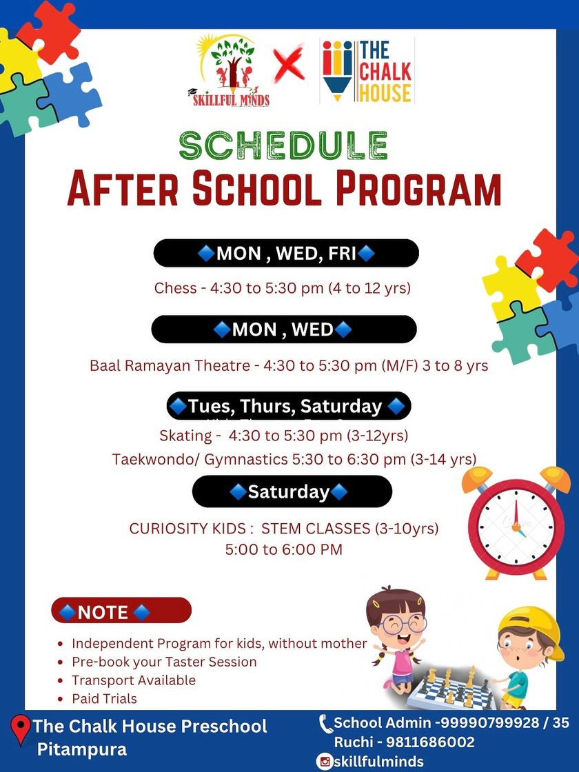 Here you can find all the practical information about our after-school programs. Browse our timetables for different locations and see the wide range of activities we offer, from multi-activity camps to specialized classes. We have centers in West Punjabi Bagh, Kirti Nagar, Paschim Vihar, and Pitampura.