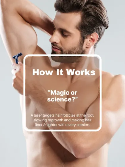 Laser hair reduction is a science, not magic. The laser targets hair follicles at the root, which slows regrowth and makes hair finer with each session. This process also helps reduce ingrown hairs and folliculitis for clearer, healthier skin.