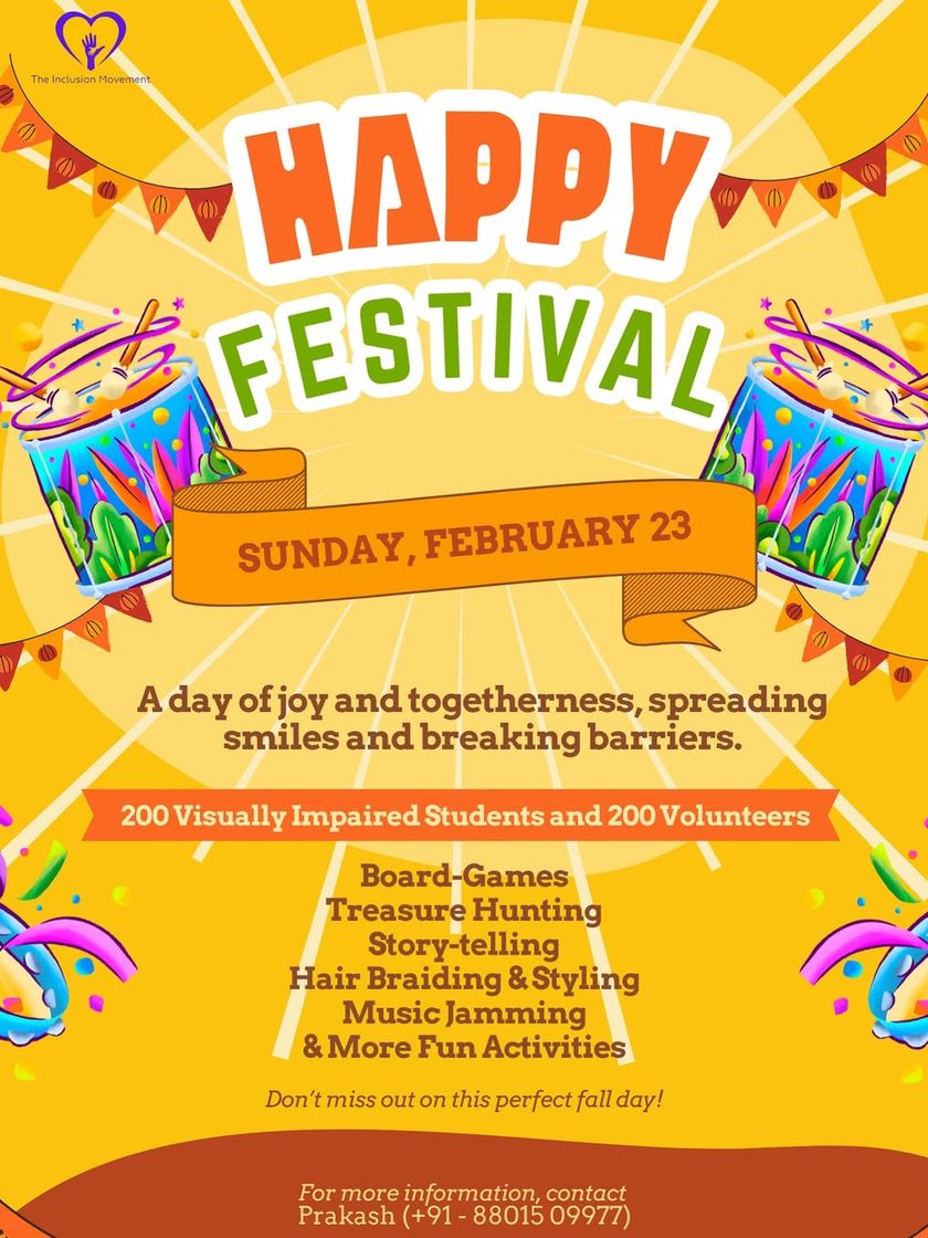 The Happy Festival is one of our key annual events, designed specifically for over 200 students with vision impairment. We partner with institutions like Manipal University to create a day filled with accessible activities like audio-described movies, tactile games, and music, all supported by 200+ dedicated volunteers.