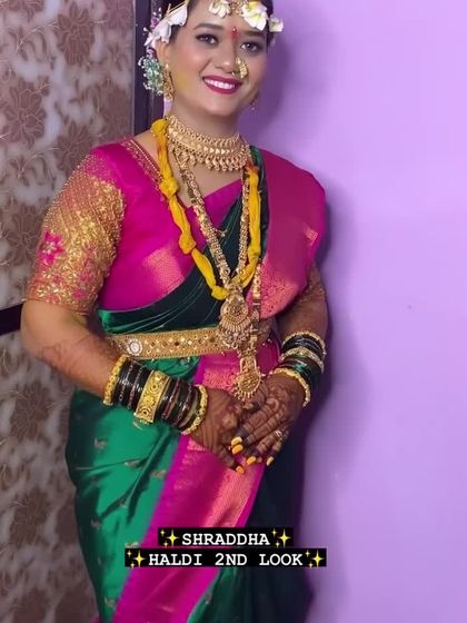 Haldi and Mehendi are the most fun-filled ceremonies, and the look should be just as vibrant. I love creating fresh, bright styles for these events, often incorporating beautiful floral jewelry. The makeup is kept waterproof and long-lasting, so you can enjoy every moment without any worries.
