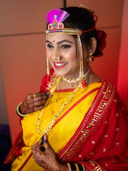This is where I celebrate our paramparik Marathmola saaj. I create authentic looks for the main wedding ceremony, specializing in draping traditional Nauvari and Agri Navri sarees and styling with classic jewelry like the mundavalya and nath. Each look is designed to be timeless, making you feel like a true 'Swaamini' on your wedding day.