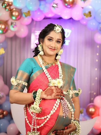 There is a special 'saundarya' in a mother-to-be. For the traditional 'dohale jevan' or baby shower, I create comfortable, radiant looks that make you feel cherished. I love using 'phoolancha dagina' (flower jewelry) to add a touch of natural beauty.