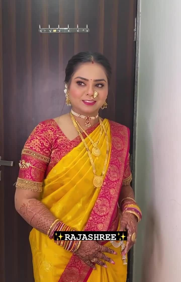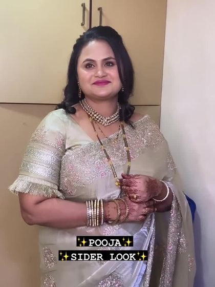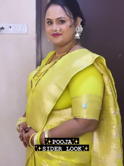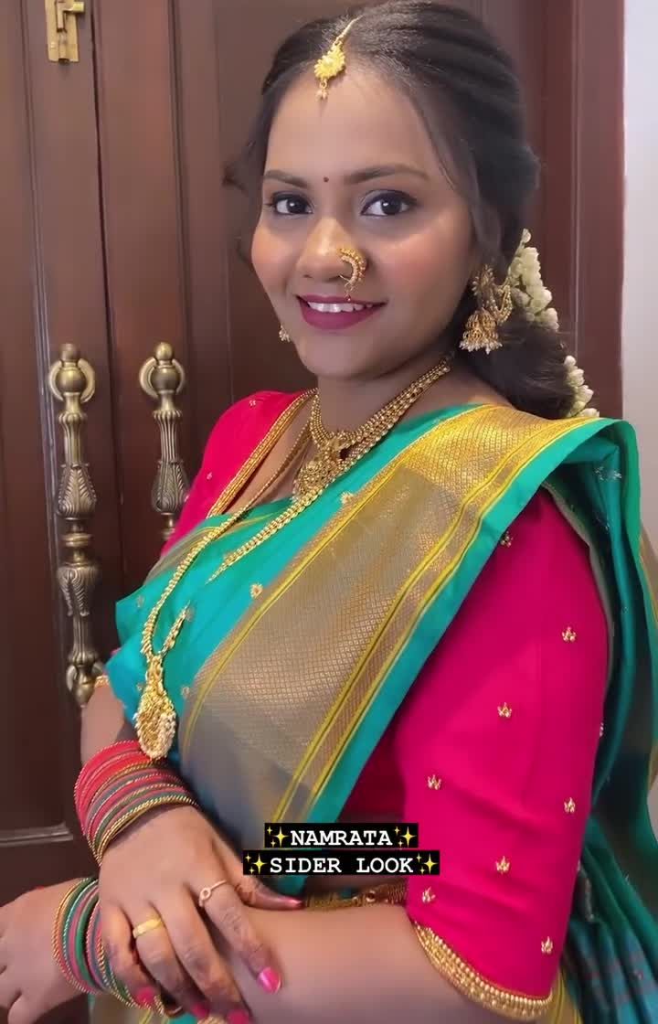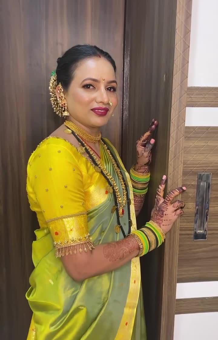 This is my specialty, the 'paramparik Marathmola saaj'. I create timeless looks for weddings and festivals, focusing on authentic details like the draping of a Paithani or silk saree, classic jewelry, and traditional hairstyles like the khopa.