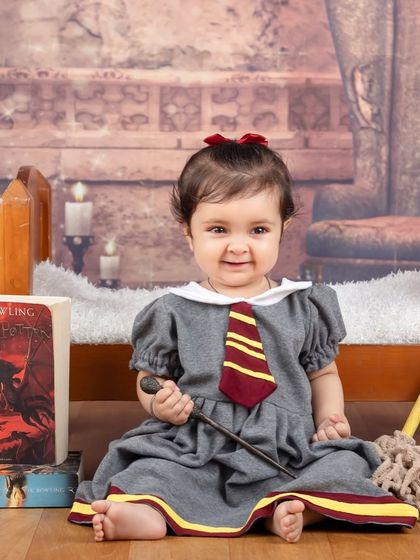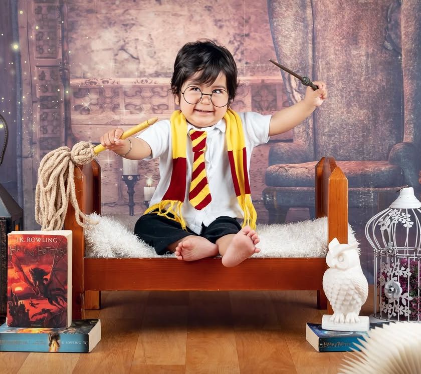 For all the Potterhead parents, this one's for you! I have created a complete Hogwarts-inspired experience for your little muggle. With Gryffindor scarves, wands, glasses, and a magical castle backdrop, we can create truly enchanting portraits.