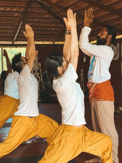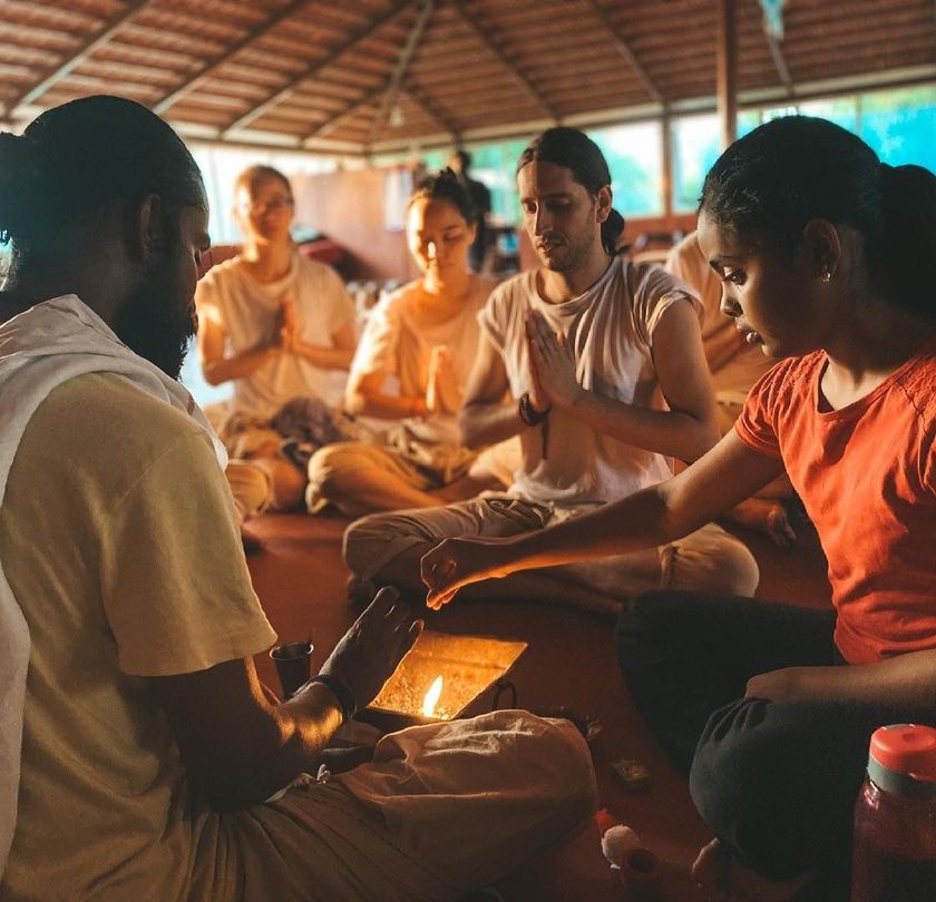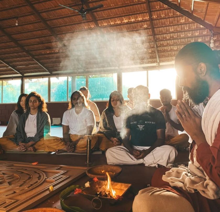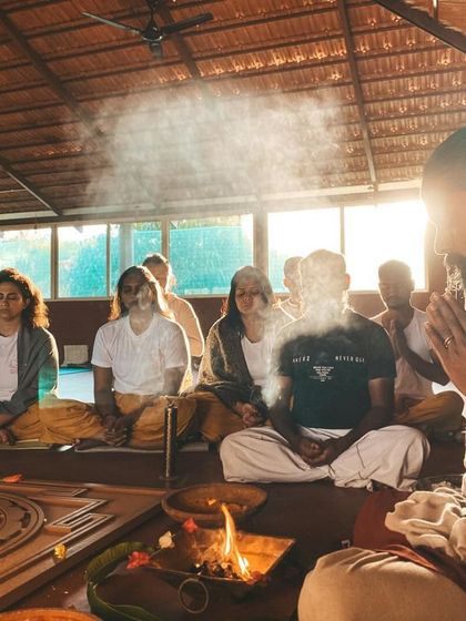 Yoga is a spiritual quest, a "work in" that connects you to the divine. This cluster shows the soul of our training, from silent meditation and pranayama breathing exercises to sacred fire ceremonies (pujas) and chanting. These practices quiet the mind, open the heart, and transform your practice into a profound spiritual experience.