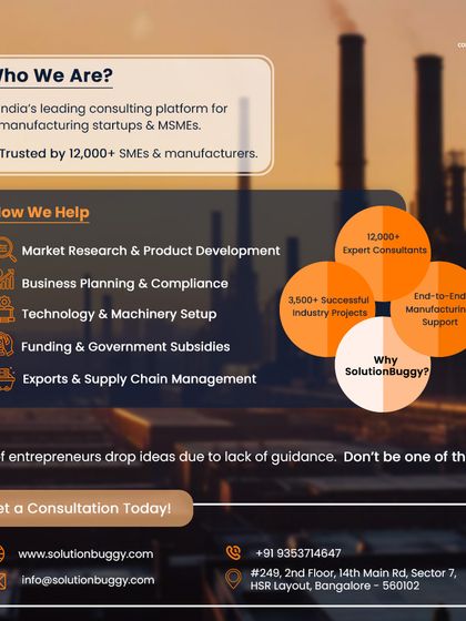 End-to-end Manufacturing Consulting - We handle everything - market checks, plant setup, machinery, compliance, and go-to-market. Total support, no half-measures.